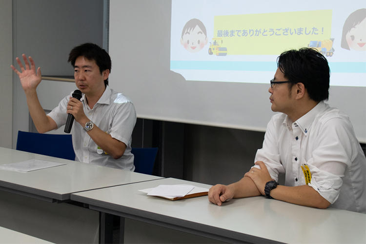 説明終了後の質疑応答では、「建物を建てる時にはどんな機械を使用していますか?」や「川田工業では何人の人が働いていますか?」などの質問があり、当社への理解を深めていただきました。